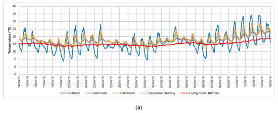 In the rooms where the glazing area is predominant, bedroom/balcony and bathroom, it was observed that the indoor temperature was not stable as it is strongly dependent on the outdoor climate conditions. The maximum temperature recorded in the bedroom/balcony was of 18.9 °C while in the bathroom was of 16.4 °C (Table 4). In these rooms, during the day, the indoor temperature followed the trend of the outdoor temperature (Figure 11a). The temperature profiles in both rooms were quite similar, but since the bedroom/balcony has a larger glazed area than the bathroom, it presented higher temperatures. The bedroom/balcony had the highest indoor temperature throughout the monitoring period, reaching temperatures close to the comfort threshold temperature. These results highlight the effect of the glazed balcony as a strategy to capture solar gains.