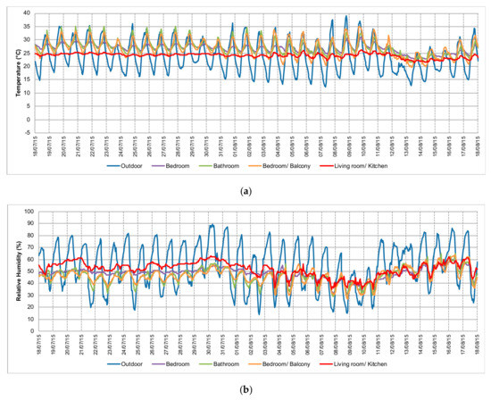 Regarding the outdoor relative humidity, it showed significant daily variations, with maximum values around 70–80% and sometimes near to 90% during the night, and minimum values varying from near 40% to minimum values of 14% during the day (Table 7). The mean value is of around 55% (Table 7). The indoor relative humidity has lower daily variations, being relatively stable (Figure 18b). The rooms with the most stable relative humidity profiles are the living room/kitchen and the bedroom. In general, the relative humidity decreases during the day due to the warmer dry air and increases during the night due to the cooler outdoor humid air that flows into the building. This is particularly visible in the rooms with the balcony, where daily variations are higher.