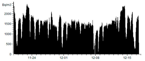 In the case study, the concentration of radon was measured during the heating season, when the ventilation rate was lower. The living room/kitchen was the room chosen for the measurements since it has the lower ventilation rates, has granite walls, is located in the ground floor, and it sits on a granitic massif. The measurements took place during 28 days, with integration periods of 10 min, started after a period of stabilisation of the radon sensor (about 60 days). Figure 20 shows the results of the measurements. It is possible to see an irregular distribution of values with several peaks. The peaks in the radon concentration are considerably above the maximum defined by the Portuguese law (400 Bq/m3) [42], with a maximum of 2660 Bq/m3, and an average concentration of 1432 Bq/m3. Although the concentration of radon was high, it has to be taken into consideration that the building was unoccupied most of the time and thus had low ventilation rates.