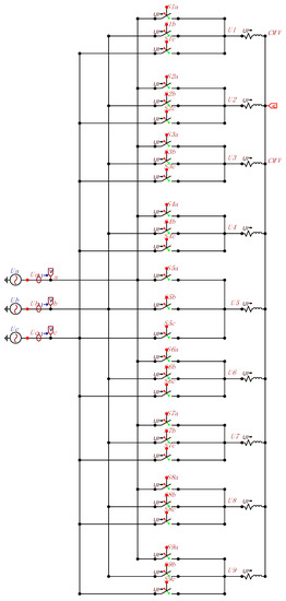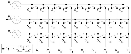 Scheme of the three-to-nine-phase multiphase matrix converter (MC) topology. Inputs are named ua, ub, uc, and outputs are named u1–u9.