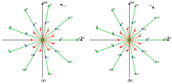 Initial arrangement on complex plane of rotating voltage space vectors that are used to eliminate the CMV in the three-to-nine-phase MC: (a) CCW; (b) CW.