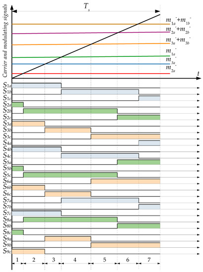 The exemplary configuration of switch duty cycles during the period Ts is presented in Figure 4. Carrier and modulating signals are compared to show switching combinations. Numbers from 1 to 7 in Figure 4 correspond to the rotating voltage space vectors that are created for certain switching states.