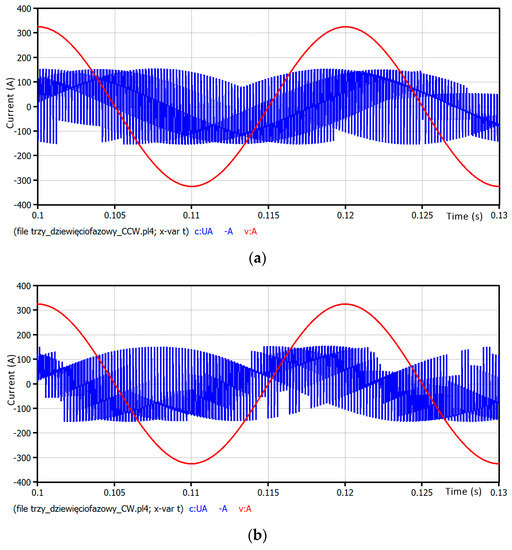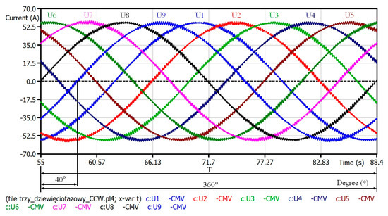 In Figure 8, the waveforms of output currents of phases from 1 to 9 are presented. The waveforms are exactly the same for the CCW method and the CW method. It can be noted that the currents are sinusoidal and the phase shift between each of phase output current is 40° (Figure 8).