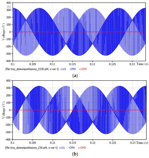 It is shown in simulation results that the CMV elimination in the three-to-nine-phase MC is achieved (Figure 9). For both CCW method (Figure 9a) and CW method (Figure 9b), the zero CMV is achieved although the phase voltage is synthesized as short modulated in time pulses equal to instantaneous input phase voltage. In the Fourier analysis of the phase output voltage (Figure 10), it is showed that in addition to the fundamental, component waveforms contain harmonics centered around the switching frequency.