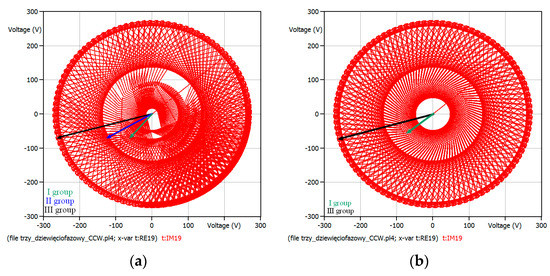 Output voltage space vector representing a nine-phase output voltage (4) can be transformed to a geometrical sum of input voltage space vectors (8). In (8), vectors named , and are voltage space vectors representing output voltage for three phases appropriately indicted in the subscripts. Those vectors can be CCW or CW rotating space vectors, and they can be described by equations from (6) or (7), respectively. The subscript, e.g., “147” in the name means appropriately the name of chosen output phases 1, 4 and 7.