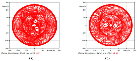 Each of the instantaneous output voltages, u1, u2, u3, u4, u5, u6, u7, u8 and u9, is connected to the one of the input phase voltages ua, ub or uc. The subscript “xxxxxxxxx” in the name means appropriately the name of input phase chosen into output phases 1, 2, 3, 4, 5, 6, 7, 8 and 9, for example, output voltage space vector . Assuming that the three-to-nine-phase MC is supplied by balanced input voltage (5), the rotating voltage space vector could be seen as counterclockwise (CCW) or clockwise (CW) rotating space vector.