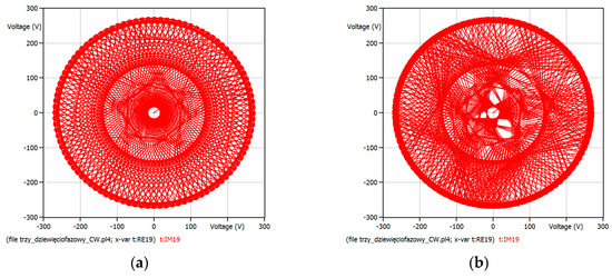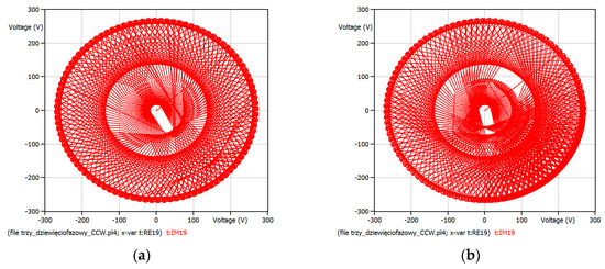 Trajectory of the output voltage rotating space vector for output frequency: (a) 30 Hz; (b) 50 Hz. Simulations performed for the voltage transfer ratio kU = 0.5, for one period of output frequency and CW method.