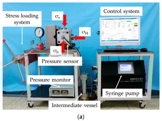 (a) Triaxial hydraulic fracturing physical simulation system setup; (b) experimental sketch [30,46].