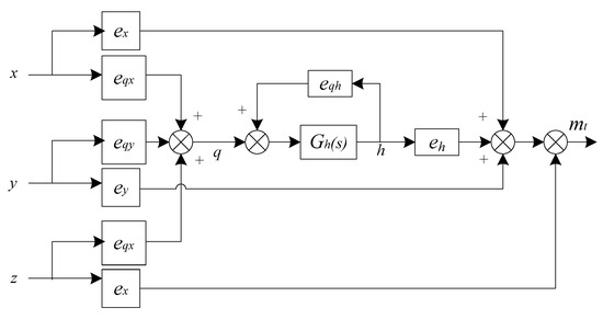 The typical hydro-turbine system model is illustrated in Figure 2. Here, x denotes the rotating speed deviation, y is the incremental deviation of the guide vane opening, z represents the paddle servomotor stroke deviation, mt is the hydro-turbine output incremental torque deviation, q is the incremental turbine flow deviation, and h is the incremental turbine head deviation. Assume z = 0, x = 0 [33], one can easily obtain
