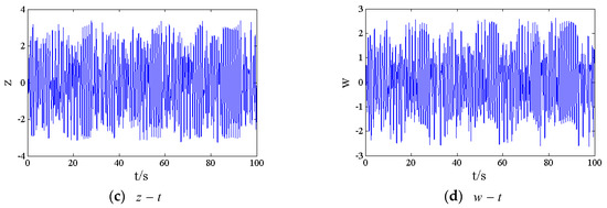 where , , , are dimensionless variables. According to reference [35], the parameters are selected as , , , , , , , , , , , , , , and . Now, to facilitate the mathematical analysis, x, y, z, and w are used to take the place of , , and , respectively.