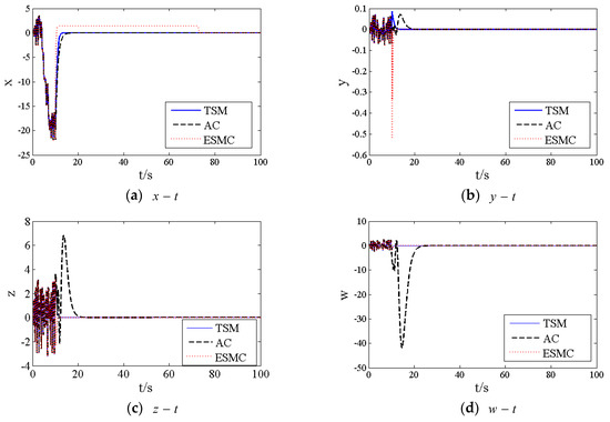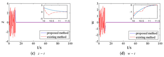 Corresponding simulation results of the state responses in the presence of the control law (44) are shown in Figure 6, which shows that the controller can stabilize the HGS (18). Besides, from the comparison of active control and the propose finite-time terminal sliding mode in Figure 6, we can clearly see that the maximum overshoot of active control is larger, especially in Figure 6c,d, and the stabilization time is longer.