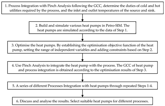 Section 2 introduces the simulation and optimisation of the considered HP types and the method of integration with the process for achieving heat recover. In Section 3, the suitability of the HP types to different temperature–enthalpy (T–H) profiles is evaluated, aiming at the minimisation of power consumption. The optimal COP of each integration case was obtained by optimising the operating parameters of the HP when given source and sink at different temperatures. In Section 4, the model is further applied to the integration of HP and different industrial process cases using Pinch Analysis, and the energy-saving potential of different types of HP is evaluated using the GCC [28].