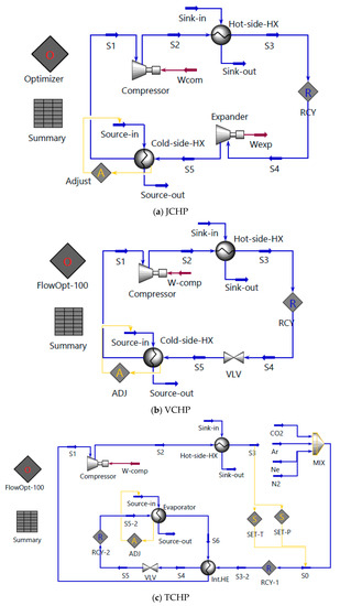 Simulation flowsheet of the heat pump as output from Petro-SIM: (a) JCHP, (b) VCHP and (c) TCHP.