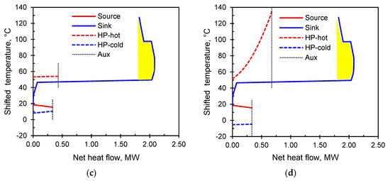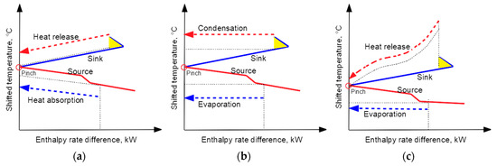 The heat duties, inlet and outlet temperatures of the heat source and sink vary among different processes. Pinch Analysis with HP placement is used, performing Steps 1–4 for a set of GCC profiles representing processes with different thermal properties. The T–H diagrams of different processes are shown in Figure 4. The configurations shown represent pairs of process heat sinks and sources of a gradual, steep and medium slope. Combinations of these are possible, but the three configurations in Figure 4 are the basic ones, which help to understand the major trends.