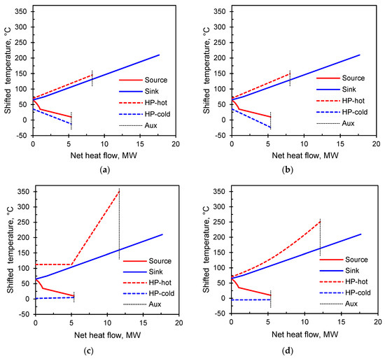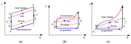 Each of these types of profiles implies a different degree of compatibility with the HP types considered in this work. The compatibility can be qualitatively assessed on the temperature–entropy (T–S) diagrams combining the process heat source/sink profiles with the HP profiles. Such plots are shown in Figure 5. The solid red lines represent the heat release or condensation of the working fluid in the HP, and the solid blue lines are the heat absorption or evaporation of the working fluid. The red dashed lines represent the heat release of the source, and the blue dashed lines represent the heat absorption of the sink. The performance of these three types of HPs (JCHP/VCHP/TCHP) is calculated by varying the inlet and the outlet temperatures of the process heat source and sink, and relating the results to the possible representations of temperature lifts ∆Tin, ∆Tout, or ∆T1, ∆T2 (e.g., Equations (3)–(6)).