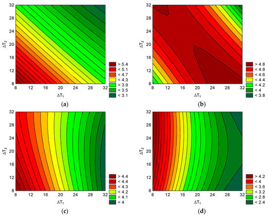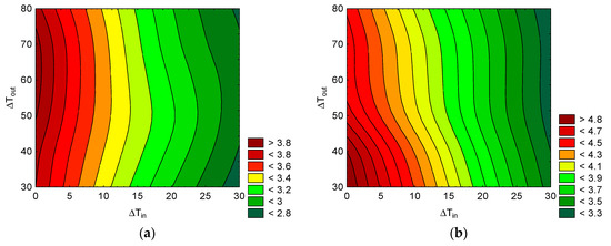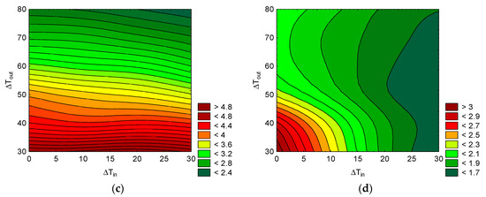 The simulation results of the considered scenarios are shown in Figure 6 and Figure 7. In Figure 6, the performance as a function of the temperature lifts expressed as the inlet and outlet temperature differences is evaluated. Figure 7 provides an evaluation of the COP as a function of the temperature lift expressed as ∆T1 and ∆T2.