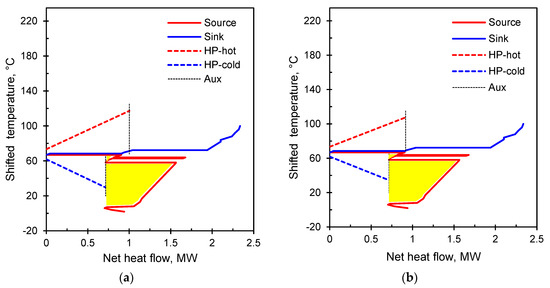 The GCC of a HP and an illustrative process is shown in Figure 3. The appropriate placement of a HP means that the heat must be recovered from below the Pinch and released above the Pinch [34]. Improper placement on either side of the Pinch will result in lower energy efficiency. The figure has two lines representing each heat exchange between the HP and the process. The thick dashed lines represent the heat transfer taking place inside the HP block—absorbing and releasing heat. The thin dashed lines represent the heat exchange directly with the process. These form extra heat circuits for minimising the probability of contamination of the internal HP fluids. All other GCC figures in this paper follow the same convention.