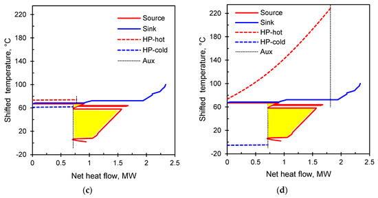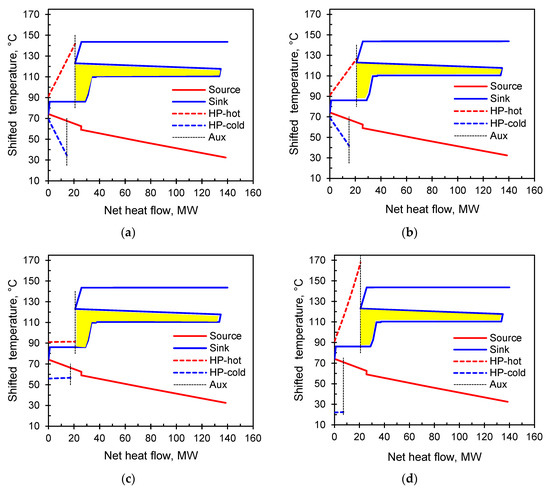 GCC of Case 1 and Process Integration using (a) JCHP-Ar, (b) JCHP-CO2, (c) VCHP and (d) TCHP.