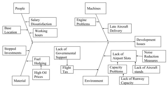 16]. In this research, the Ishikawa diagram is used as a tool to map the issues of the airline industry into the factors that affect the airline industry. Ryanair went into a labor dispute with its pilots, which led to strikes (personnel). After a short life as an LCC, Primera Air filed for bankruptcy since the supplier of aircraft, Airbus, was late with their delivery (machines). Primera Air already planned forward on having these aircraft, so they had to find replacement lease aircraft to carry out their promised services. This led to their fate of filing for bankruptcy. It shows how difficult it can be to enter the market and to maintain the position. Air Berlin had to file for bankruptcy after the stop of investments from Etihad Airways (material), and airlines had to deal with higher fuel prices (material). Slot problems are mainly due to a lack of capacity at airports or limitations in slots (environment). The causes led to the development issues are summarized by the following diagram (