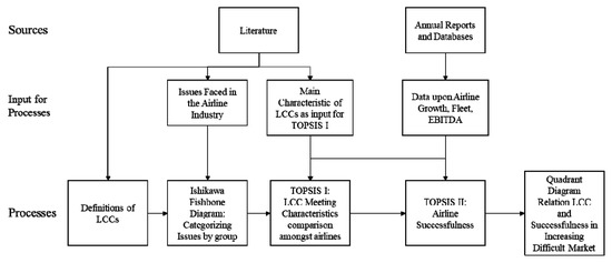 Figure 2. The processes were supplied with information through input from literature, annual reports, and databases. Analysis of the literature revealed the definition of LCCs and describes the issues faced in the airline industry, and forms a list for the main characteristics of LCCs. The issues faced were mapped into the Ishikawa diagram, where the issues were grouped by the affected factors of the airline process. The main characteristics of the LCCs provide input to the first TOPSIS, which compares the business models of the airlines on how they are meeting the listed LCC-characteristics. Annual reports and data from databases form the input of the second TOPSIS, which focused on growth, EBITDA, and efficiency of the airline. The output of both TOPSIS processes were mapped into a quadrant diagram, which shows how the airlines are meeting the characteristics and how successful they are.
