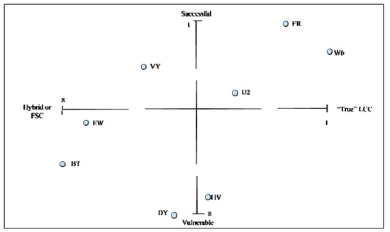 The quadrant diagram shows the positions of the different airlines regarding successfulness and meeting the LCC criteria. The axes are successful, vulnerable (vertical), and “hybrid carrier/FSC or True” LCC. The quadrants wherein the airlines can be located: