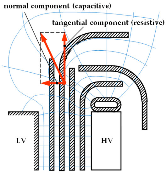 Electric field distribution at the upper end of the transformer winding, based on [6].