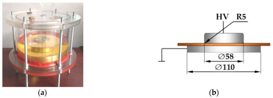 The samples were tested in a chamber filled with mineral oil. The chamber is shown in Figure 3a. In the case of two electrodes (Figure 3b) with different diameters, partial discharges of the surface type (creeping discharges) are generated. Discharges of this type have tangential and normal components, resulting from the presence of an oblique electric field—such as that in the transformer, as shown in Figure 2.