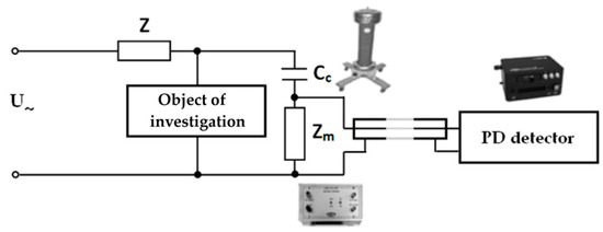 Measuring setup; Cc—coupling capacitor, CC 1000/40, LDIC; Zm—measuring impedance, LDM—5/U, LDIC; PD detector—PD Smart, LDIC.