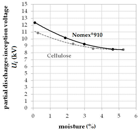 The inception voltage of partial discharges (PDIV) of all tested samples decreased with increasing moisture content. Nomex® 910 has a significantly higher inception voltage than the cellulose paper, although this difference decreased with the moisture of the samples.