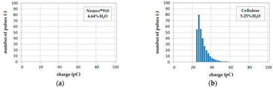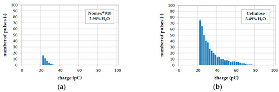 Figure 6 shows that for very dry insulation (0.1% for Nomex® 910 and 0.27% for cellulose), the frequency of the discharge pulses and the range of their charge in both materials have a very similar value. However, with increasing moisture content of the samples (Figure 7), it can be seen in the case of cellulose paper that the maximum charge in this material was much higher than in Nomex® 910. Also, the frequency of impulses appearing was much higher in cellulose.