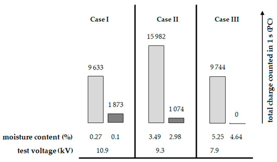 Analyzing the results of the investigation of the three pairs of samples conditioned under the selected conditions, it can be concluded that in all three cases, the total charge carried by partial discharges pulses within 1 s in aramid-enhanced cellulose paper was much smaller than in cellulose paper (Figure 9). When the samples of cellulose and Nomex® 910 were relatively dry, 0.27% and 0.1% moisture respectively, the total charge in aramid-enhanced cellulose paper was 5.1 times smaller. With higher moisture, 3.49% and 2.98% respectively, the total charge in aramid-enhanced cellulose paper material was 15 times smaller, while with significant moisture, equal to 5.25% and 4.64% respectively, partial discharges for the selected test voltage were not present in the Nomex® 910 samples at all. The lower intensity of partial discharges in aramid-enhanced cellulose paper than in cellulose should be considered an important advantage of this material.