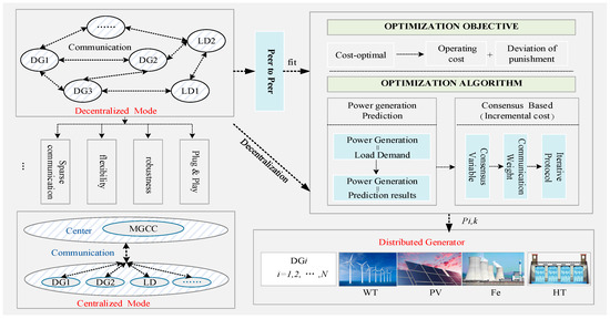 At present, decentralized optimization algorithms mainly depend on consensus or multi-agent systems. Each node/agent in a system only concerns about local decision variables instead of global information, and neighboring nodes/agents communicate with each other to cooperate together for achieving optimization results [4]. For example, a multi-agent system-based hierarchical control method was applied in autonomous microgrids for cooperative frequency control with communication constraints [5]. A state-based consensus method [6] was proposed, which made use of the state information of DGs to calculate the optimized dispatching strategy under a layered architecture. However, such methods still rely on the control center to collect the information and to send to each DG. To fully decentralize the optimization and to remove the control center, Ref. [7] proposed a consensus-based approach for economic dispatch problems in a smart grid without any center or leaders. On this basis, Ref. [8] proposed a distributed algorithm to solve the resource allocation over dynamic digraphs, which is adaptable to the scenario under the time-varying graph. Noticeably, all of the above methods required the information of total load demand in a microgrid to keep the balance constraint between power supply and load demand in the optimization. Moreover, to consider the impact of load on the cost optimization, Refs. [9,10,11] established the utility function of each load. However, the total load demand information was gained through load forecasting [12], which depended on a prediction center. Hence, the center restrains the decentralization faith. In addition, the setting-up of utility function of each load needs distributed loads’ information, which requires setting sensors at each load. It is difficult to implement in large-number and distributed load scenarios. Therefore, an effective measure should be carried out to solve the above problem.