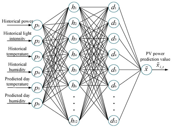 Since the short-term generation prediction of microgrid is a prediction of time series, Long Short-Term Memory Network (LSTM) is more suitable for generation prediction and is used for the prediction of DGs power output in this section. Take the short-term prediction neural network model of PV generation as an example. The impact factors of Photovoltaic (PV) generation, which are treated as input vectors, contain the historical power, light intensity, temperature, and humidity, as well as the temperature and humidity of the predicted day. Meanwhile, the final output of the prediction model is the predicted power of PV, with only one type of data. The neural network model is presented in Figure 2.