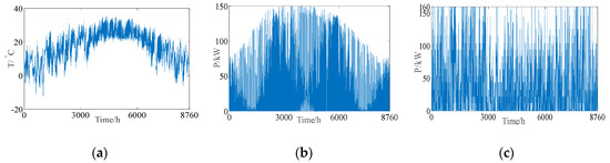 Annual historical temperature (a), Annual output power of PV (b), Annual output power of Wind Turbine (WT) (c).