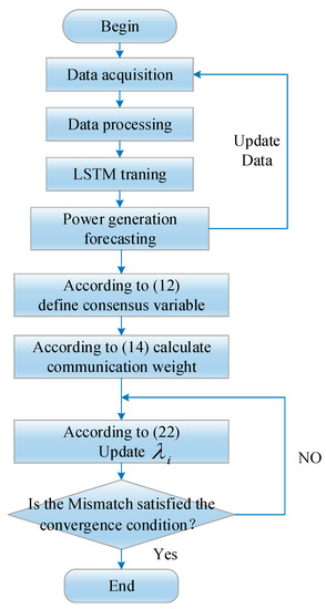 - A load demand–power generation equivalent forecasting method is proposed in the optimization algorithm, which only needs the information of predicted power output instead of load demand. The historical power generation data, which is used for prediction, has already satisfied the balance constraint of power supply and load demand. Therefore, when the balance between the real power output and the predicted output is gained, the equation constraint of power supply and load demand is satisfied. Thereby, the load demand information could be substituted by the predicted power generation in a local way.