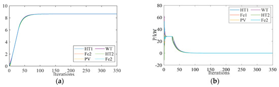 In this case, the convergence of the proposed method (22) is tested. As the time-scale is an hour, we chose an hour of a day randomly to operate the simulation. The simulation results—the optimal consensus variable , mismatch yi, DGs output power xi, and the sum of xi are presented in Figure 7.