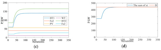 When the total predicted output D = 440 kW, the optimal solution is approximately = 8.65. Obviously, all consensus variables (Lagrange multipliers) converge to the optimal value through the proposed algorithm. As shown in Figure 8a, they rise monotonously non-decreasing until the upper boundary (Note that represents the incremental cost which is affected by the coefficient in the cost function). Figure 8b shows values of the feedback (mismatch) y of all DGs convergent to zero which proves that the mismatch is decayed with iteration. Figure 8c indicates the optimal power output. As shown in Figure 8d, the sum of the outputs of all DGs keep in balance with the total predicted value which meets the supply and demand constraints.