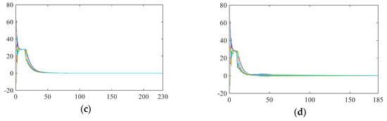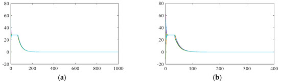 where , D is defined as the total value of the predicted output in Section 2. The estimation method enables the algorithm to get rid of a leader and the initialized value can be any fixed admissible values and , without impact on the convergence.