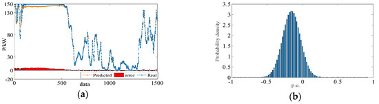 The error between the real value and the predicted value (1500 data) is presented in Figure 5a. From the analysis, the error distribution of WT obeys a Gaussian distribution and is treated as a p. u. value in Figure 5b. When the prediction error is considered, the output of WT becomes a possible range in Figure 5c.