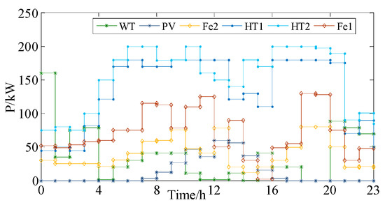 where, is the cost of generation, which mainly contains the cost of real outputs of DG units; is the cost of ith DG output; is the real output of ith DG at time t; , , and are the real output of each PV, WT, Fe, and HT at time t in a microgrid, respectively; , , and are the number of each DGs, respectively. .
