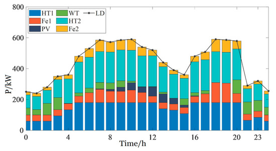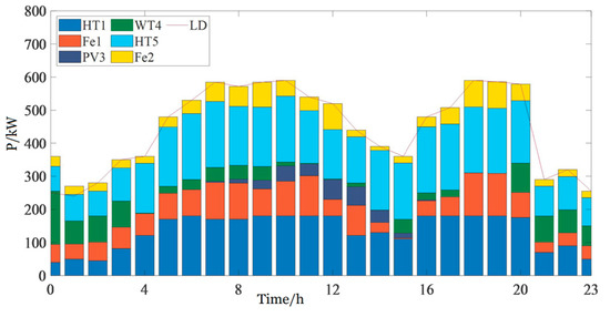 In addition, it can be seen from the tendency of lines LD that the sum of the predicted value is consistent with the load demand. Specifically, the peak periods are from 6 a.m. to 12 p.m. and from 5 p.m. to 9 p.m. with larger load demand and power generation. The valley period is from 10 p.m. to 6 a.m. (the next day) and from 1 p.m. to 5 p.m. with smaller load demand and power generation. Meanwhile, to gain clearer observation, the values are presented in Table 4. We can see that the renewable generators WT and PV take the maximum use and the hydro power and the fuel turbines generation to adjust the mismatch flexibly aiming at the optimal objective—the minimum operation cost.