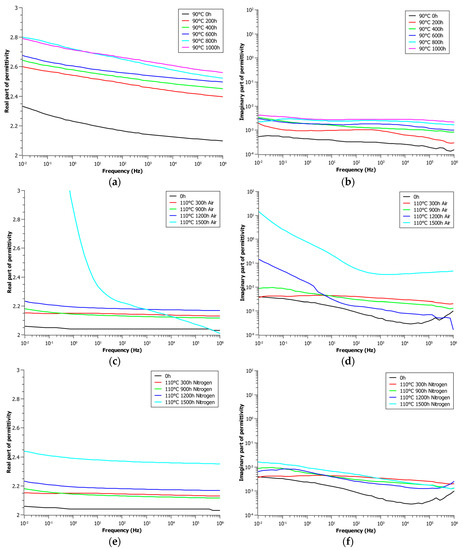 Real (a,c,e) and imaginary (b,d,f) part of permittivity as a function of the frequencies and aging times of 90 °C in air, 110 °C in air, and in nitrogen aging, respectively.