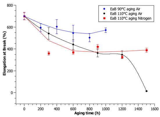 The elongation-at-break results for the 110 °C aging and for both the conditions considered show that the first aging period causes a significant decrease of the EaB value. In particular, the in-air treatment causes a constant decrease of EaB, which results in an abrupt reduction of the relative EaB (under 50%) for very long aging periods (longer than 1200 h).