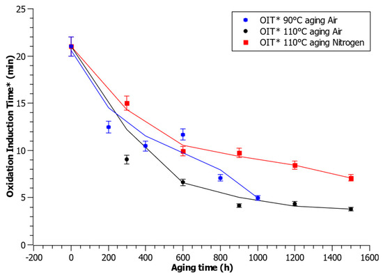 In particular, in-air aging leads to a more substantial decrease of the OIT* value with respect to the nitrogen treatment imputable to antioxidant depletion made by environmental oxygen, which induces a reduction, by about 25%, from the initial OIT* value.