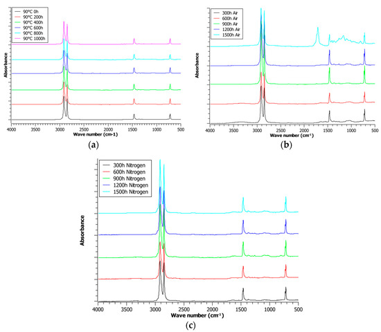 FT-IR measurements for different aging time in air (a) 90 °C aging; (b) 110 °C aging, and in nitrogen (c) 110 °C aging.