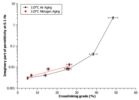 Moreover, a tentative correlation between the low frequency dielectric response and the crosslinking grade can be highlighted in Figure 5. As a result, the dielectric permittivity at low frequencies was shown to be related to the increase of the crosslinking grade with aging time. Indeed, for both the aging conditions considered (in air and under nitrogen), there is an exponential dependence between these two parameters, as shown in Figure 6. This behavior could be linked to the fact that the crosslinked moieties reveal reduced mobility under the electric field; therefore, its dielectric relaxation time is longer in comparison to non-crosslinked moieties. This corresponds to an increase of the low-frequency dielectric losses probably due to a lower frequency polarization peak out of the analyzed range. It is worth commenting that the longest nitrogen aging shows no significant increase of the crosslinking grade (less than 30%). As a result, the imaginary part of permittivity remains in the same order of magnitude for the entire aging period and no exponential raise can be observed.