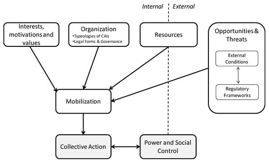 CAIs can take several forms of management and organizational structures—from working groups, grassroots organizations, and foundations to neighborhood associations and cooperatives. These structures provide opportunities for citizens to be more engaged with each other and can offer platforms to be involved in policy-making processes. Tilly [] created a model for understanding how individuals from the civil society form collectives that mobilize and act as contenders to challenge incumbent regimes.