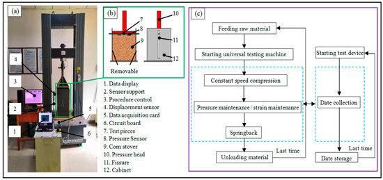 The compression procedures were illustrated in Figure 1c. After the raw materials were fed, the universal testing machine and the test facility were started, and the pressure head pressed the straws at a constant speed of 80 mm/min. When the compression stress reached the preset maximum, the stabilization process was initiated. Then the pressure head was returned at a constant speed of 300 mm/min to the initial position. Throughout the tests, the compression forces and the displacements at the straw surface and testing points were recorded in real time.