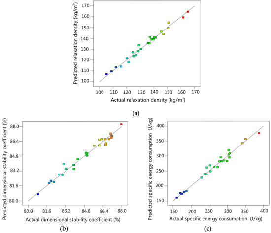 ANOVA is generally used as an important means of testing the significance and accuracy of a model [23]. The results above were sent to quadratic regression on Design-Expert 8.0.6, and the ANOVA of response surface methodology (RSM) is illustrated in Table 5. The coefficients of determination (R2) of relaxation density, stability coefficient and specific energy consumption were all larger than 0.97, suggesting that more than 97% of variations in the indices can be explained by the models. The predicted vs. actual values for the relaxation density, dimensional stability coefficient and specific energy consumption are shown in Figure 3. Predicted R2 was obtained by fitting, indicating good agreement between the predicted and actual values of three response models. In Table 5, the differences in Adjusted R2 and Predicted R2 were all less than 0.2 among the three models, also indicating that the three response models were highly consistent. The Adeq Precisions of relaxation density, stability coefficient and specific energy consumption were 25.79, 21.38 and 23.25 (far larger than 4), suggesting the models are precise [36].