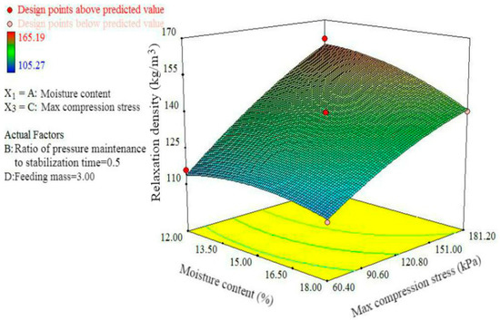 Effects of moisture content and max compression stress on relaxation density (ratio of pressure maintenance to stabilization time of 0.5 and feeding mass of 3 kg).